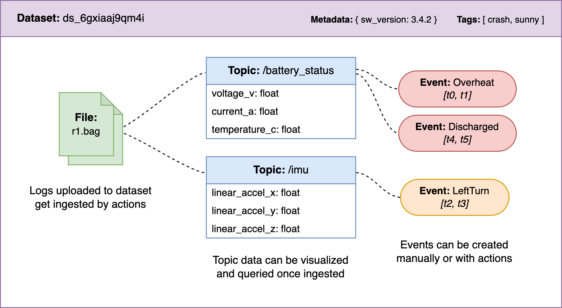 Datasets can have associated tags and metadata to improve search and capture important context. For example, you could tag a dataset with crash or add metadata such as sw_version=3.4.2.