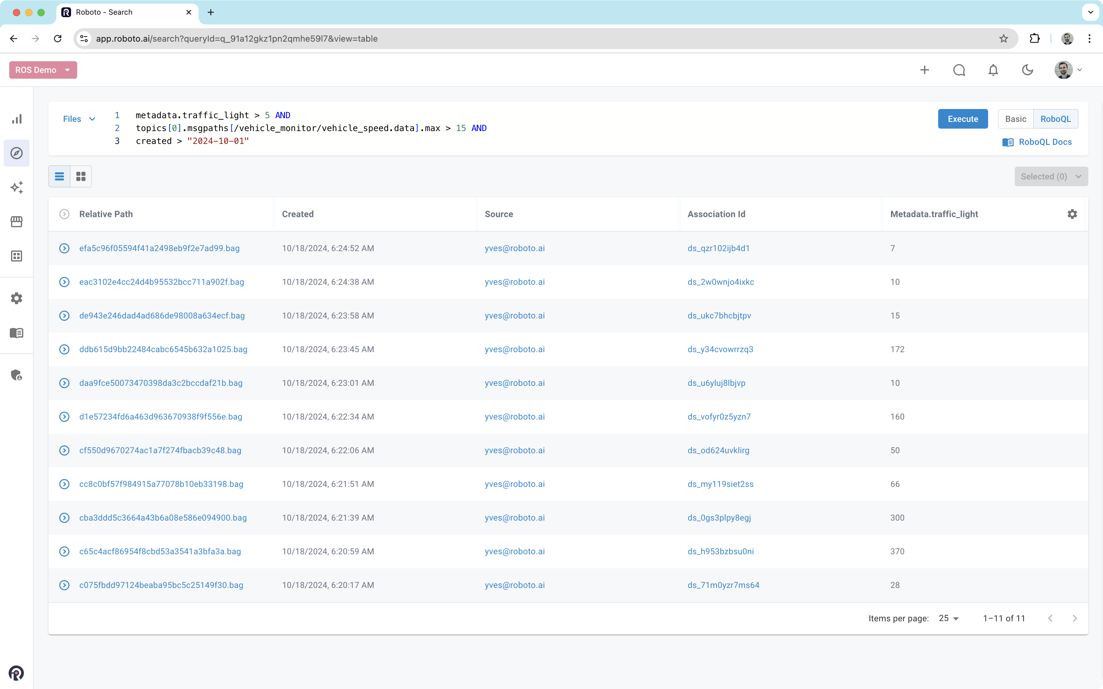 RoboQL is a query language used to search all data elements in the Roboto platform. It enables users to write succinct and powerful queries for datasets, files, topics, message paths and events. The syntax is easy to learn and succinct enough to be used in a search bar.