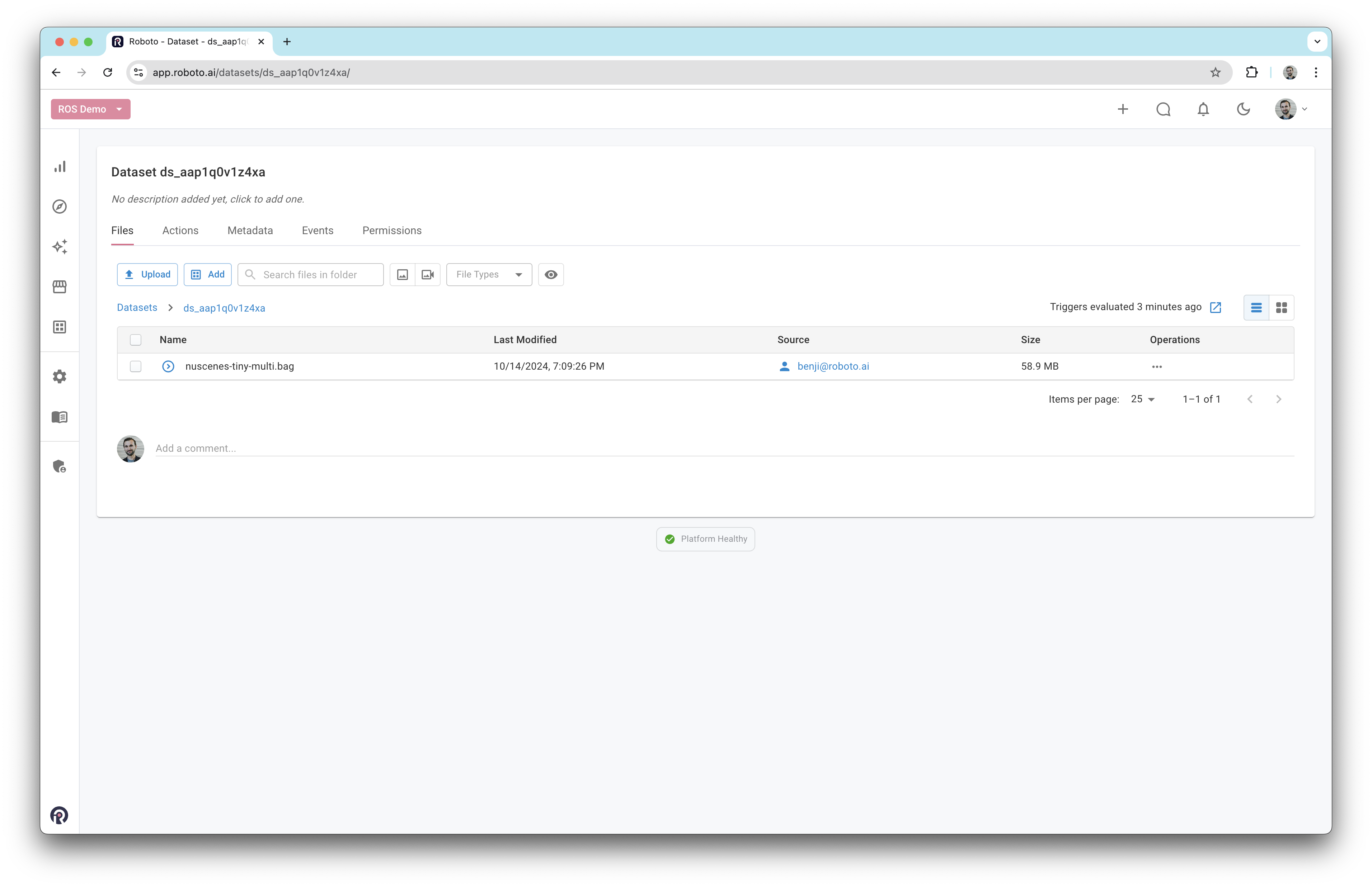 Once created, download this sample log (nuscenes-tiny-multi.bag) and upload it to your Roboto dataset. This is a ROS bag file, but you can use other ingestable log formats too, such as a PX4 ULog.