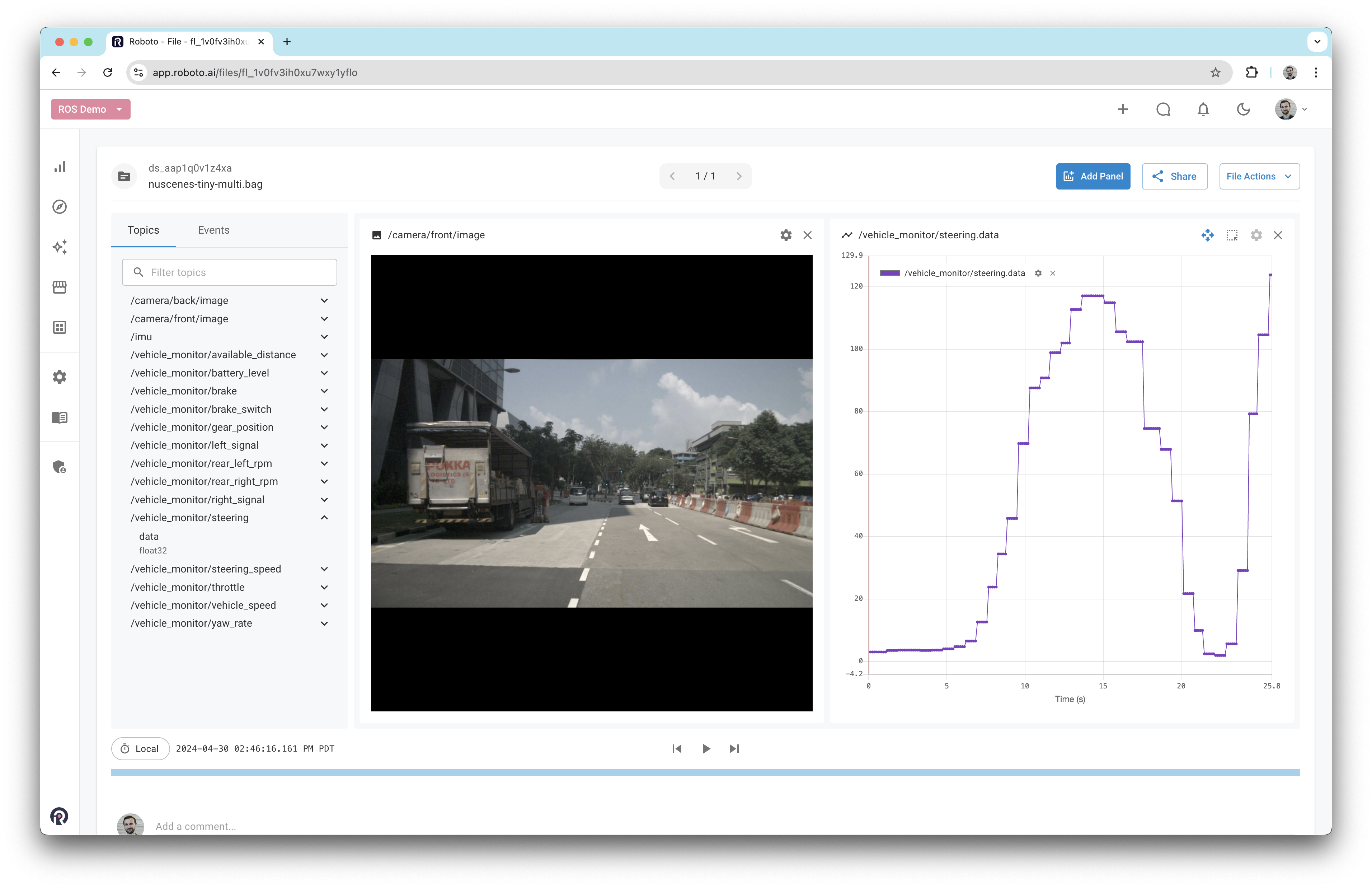 Once the log file has been ingested, you can double click on it to be taken to the visualizer. You can learn more about visualizing ROS data at Visualize Data.
