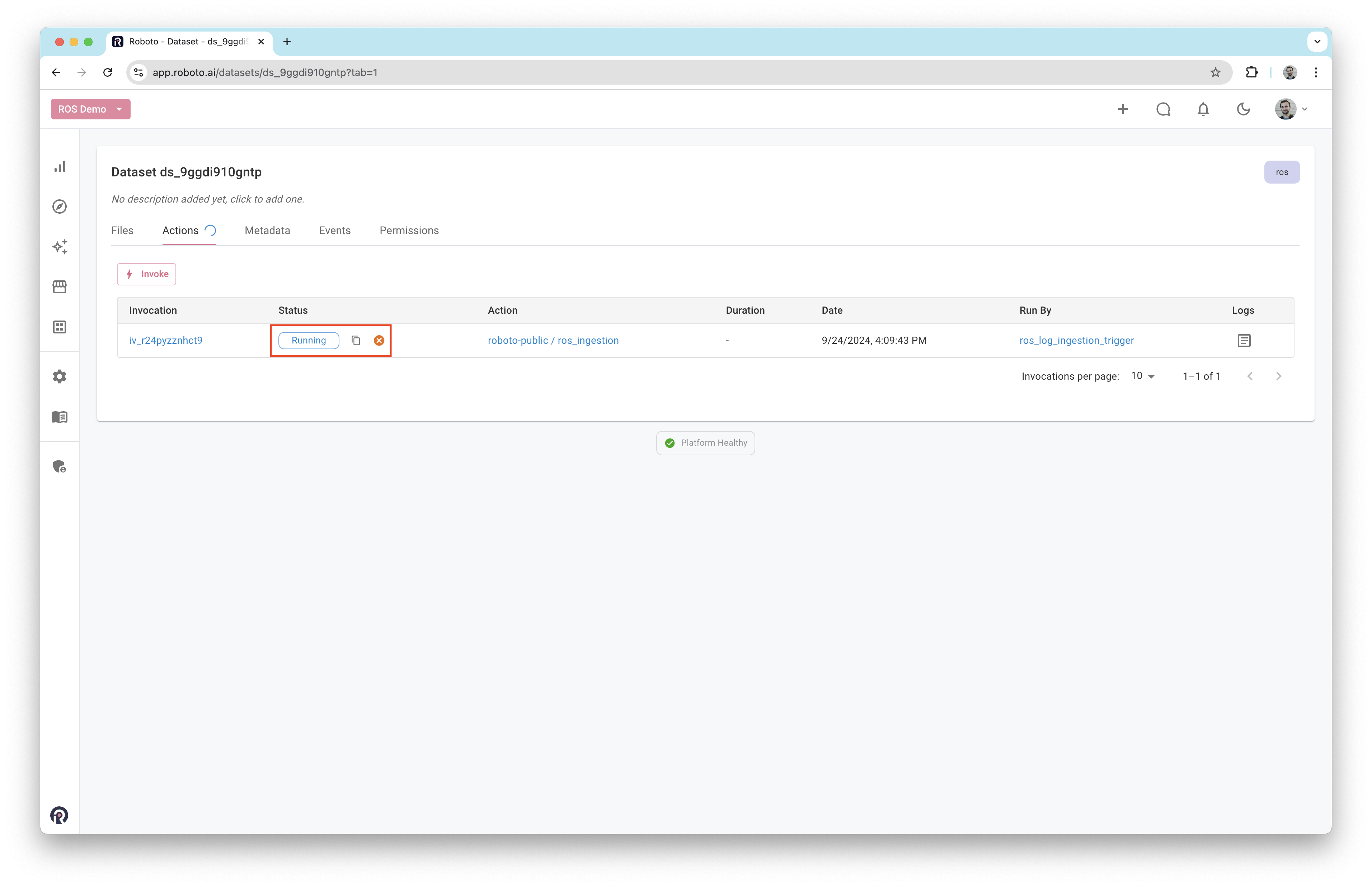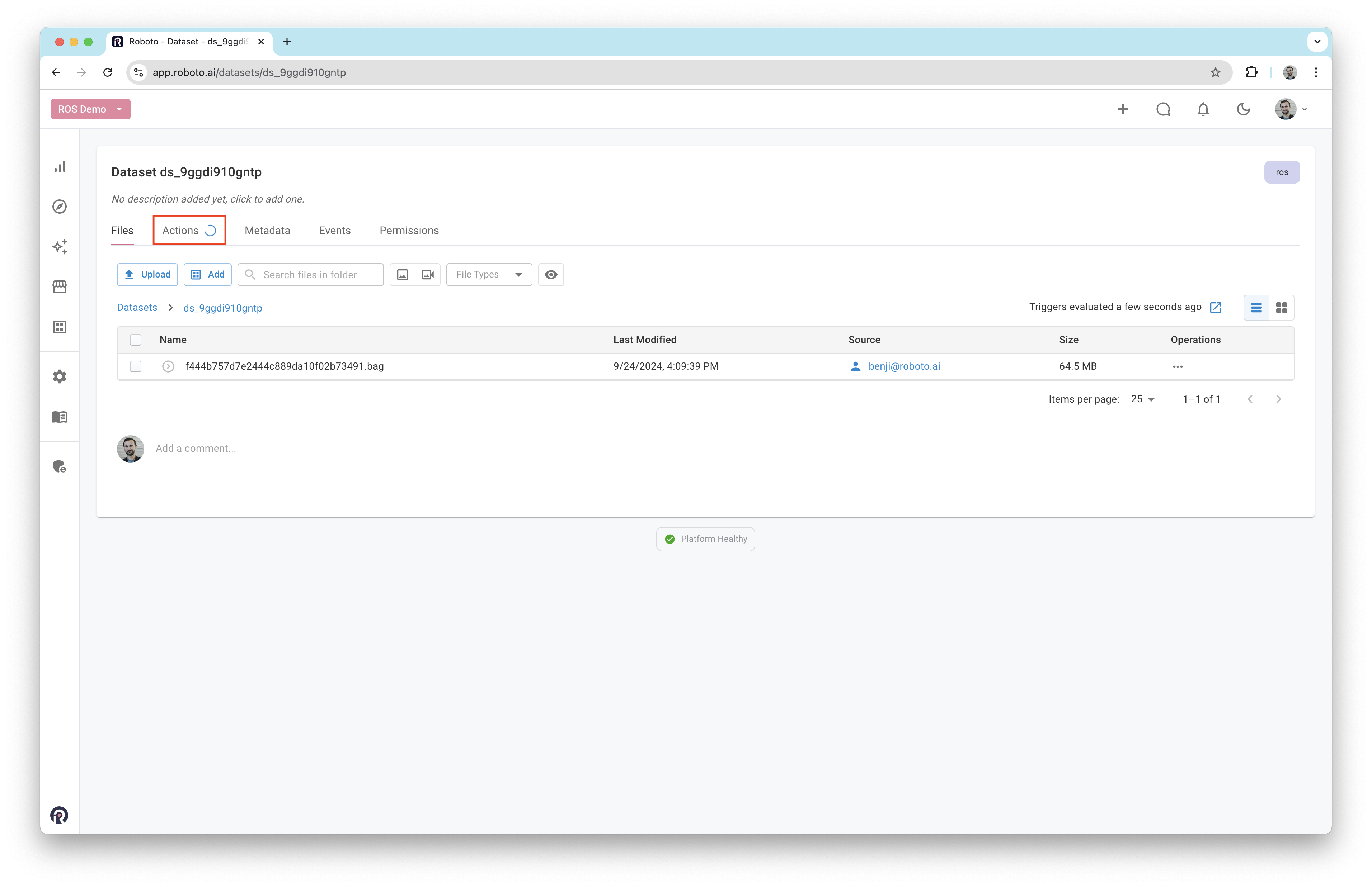 After uploading a log, Roboto will automatically trigger the ingestion process. A blue spinner next to the Actions tab indicates that ingestion is in progress. This may take a few seconds to appear if Roboto is under heavy load.