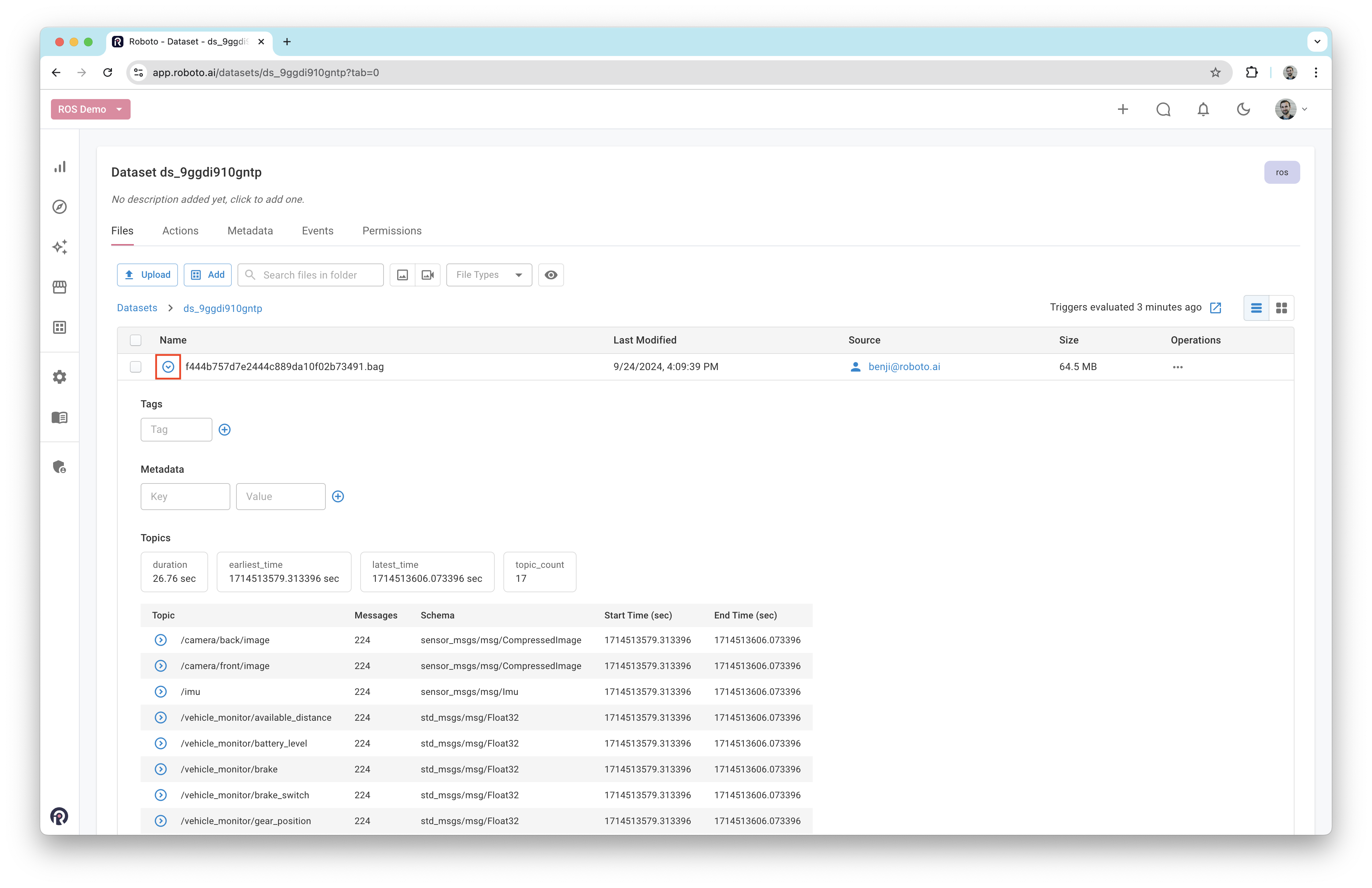 Once created, you will be taken to the dataset. Upload your log (.bag, .mcap or .db3) by dragging it into the dataset. Note, if you’re uploading a db3 file, you will also need to upload the corresponding metadata.yaml file.