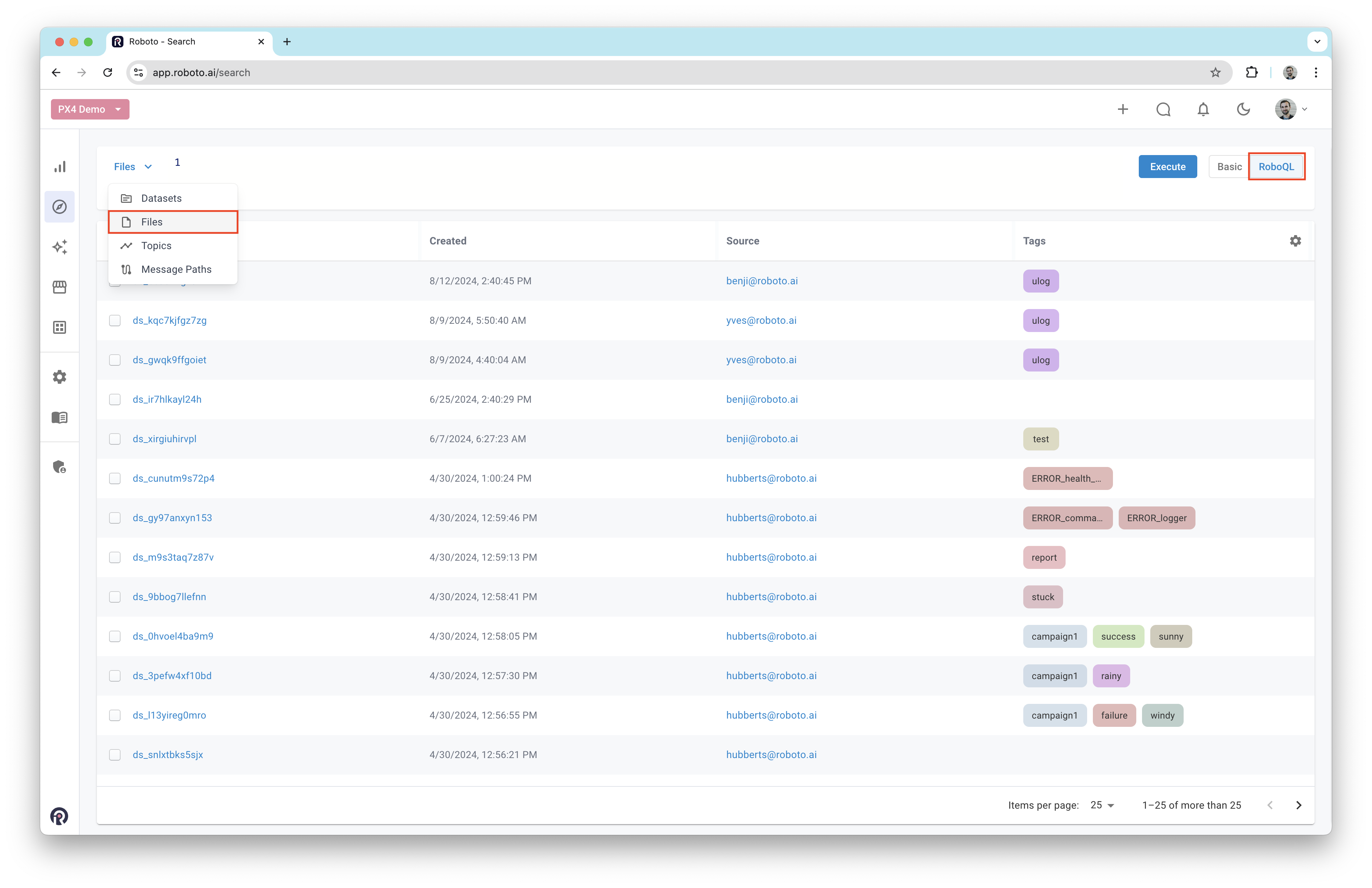 For the examples below, we uploaded about 1000 publicly available PX4 ULog files into an example Roboto account. The data includes logs from various vehicle types such as multirotors, fixed-wing aircraft, and VTOLs.
